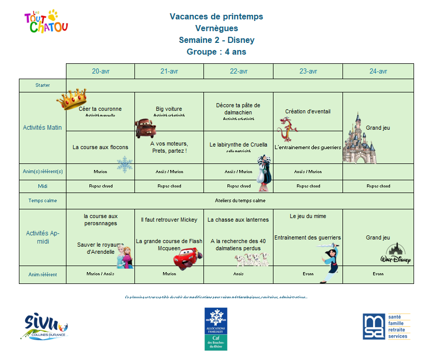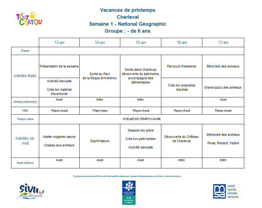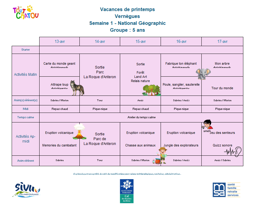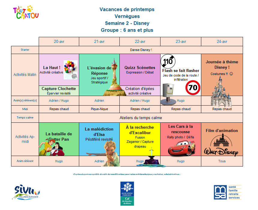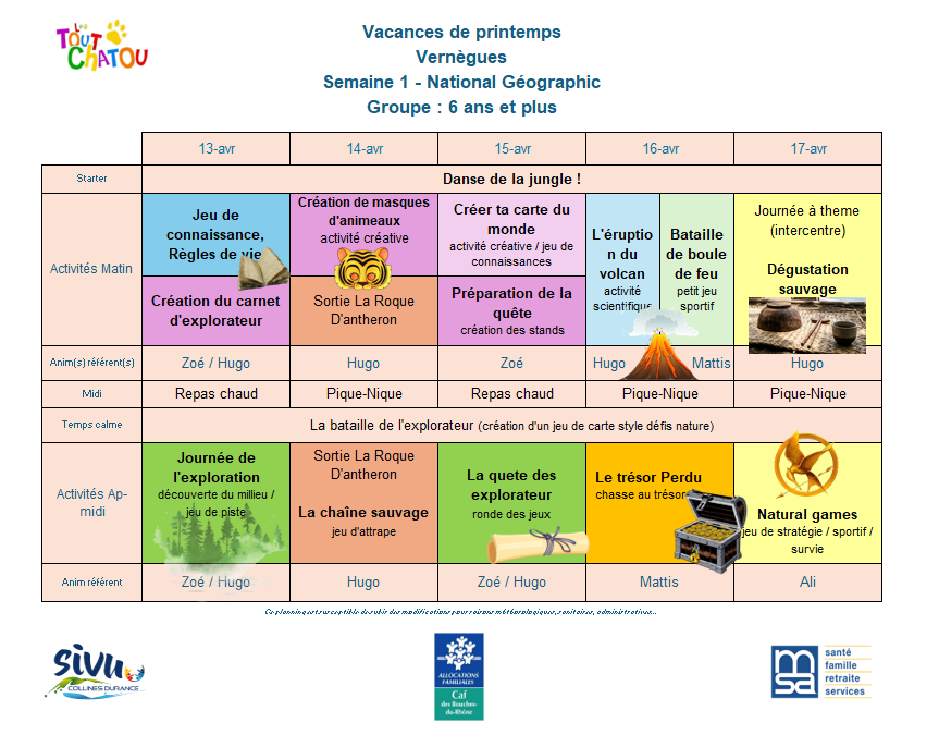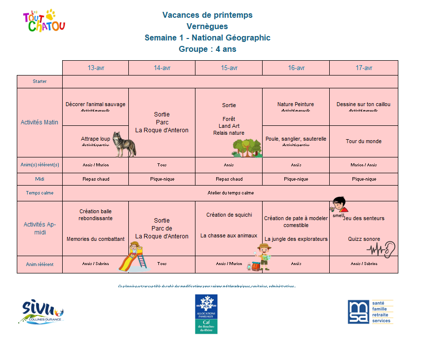 Plannings des vacances de Pâques 2026