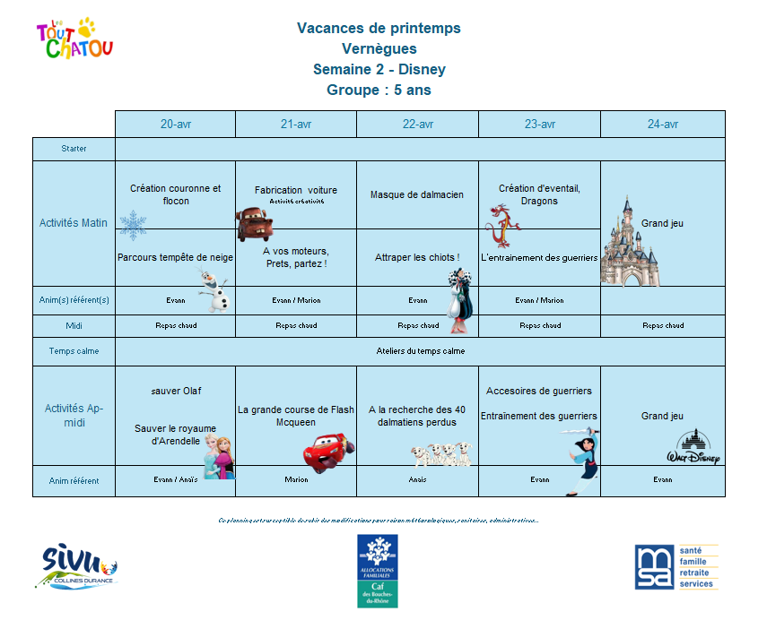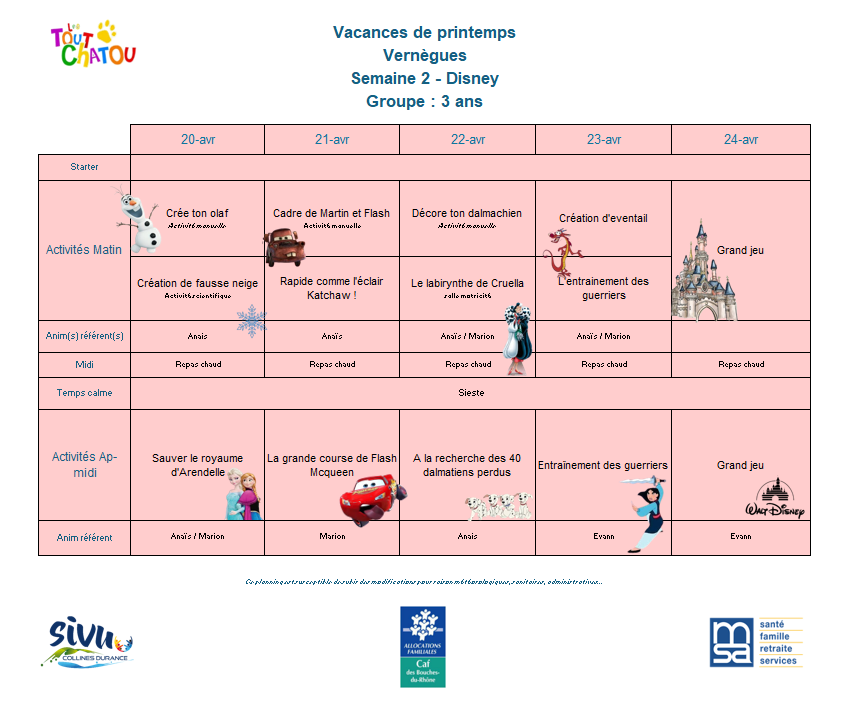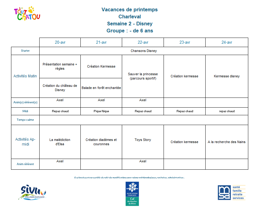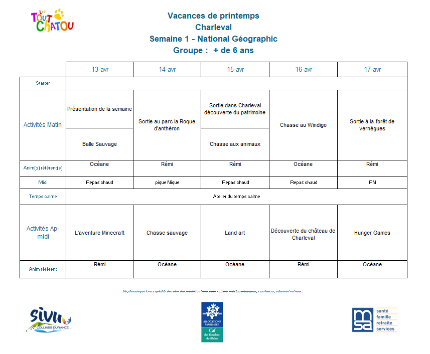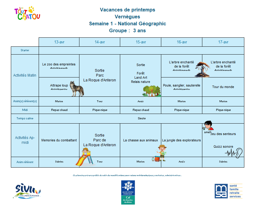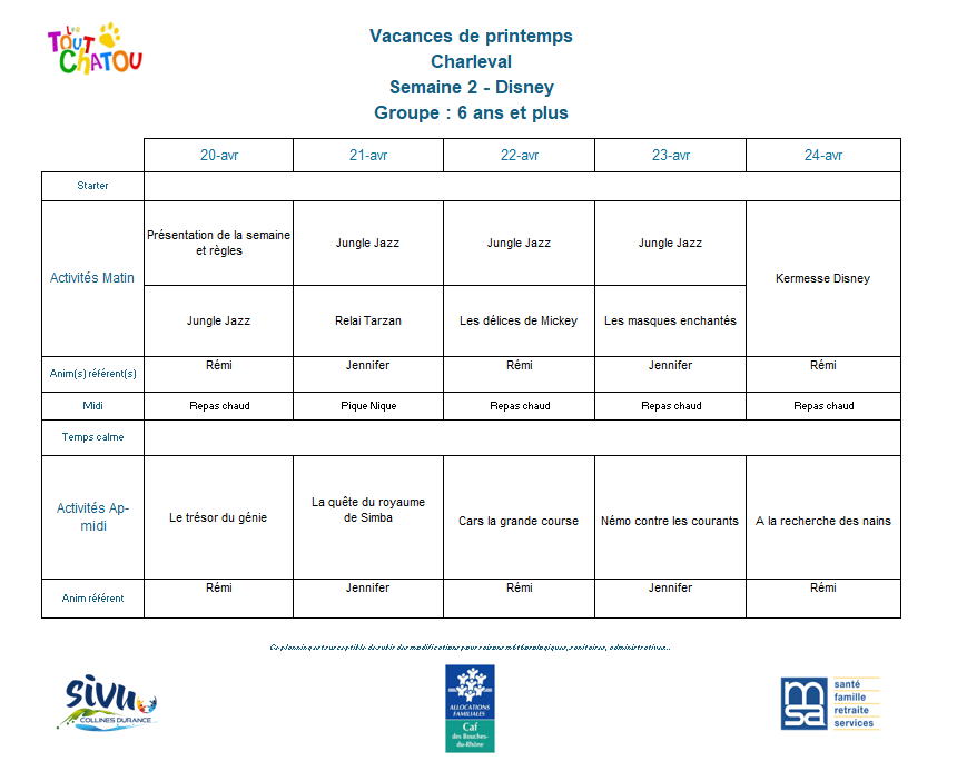 Plannings des vacances de Pâques 2026